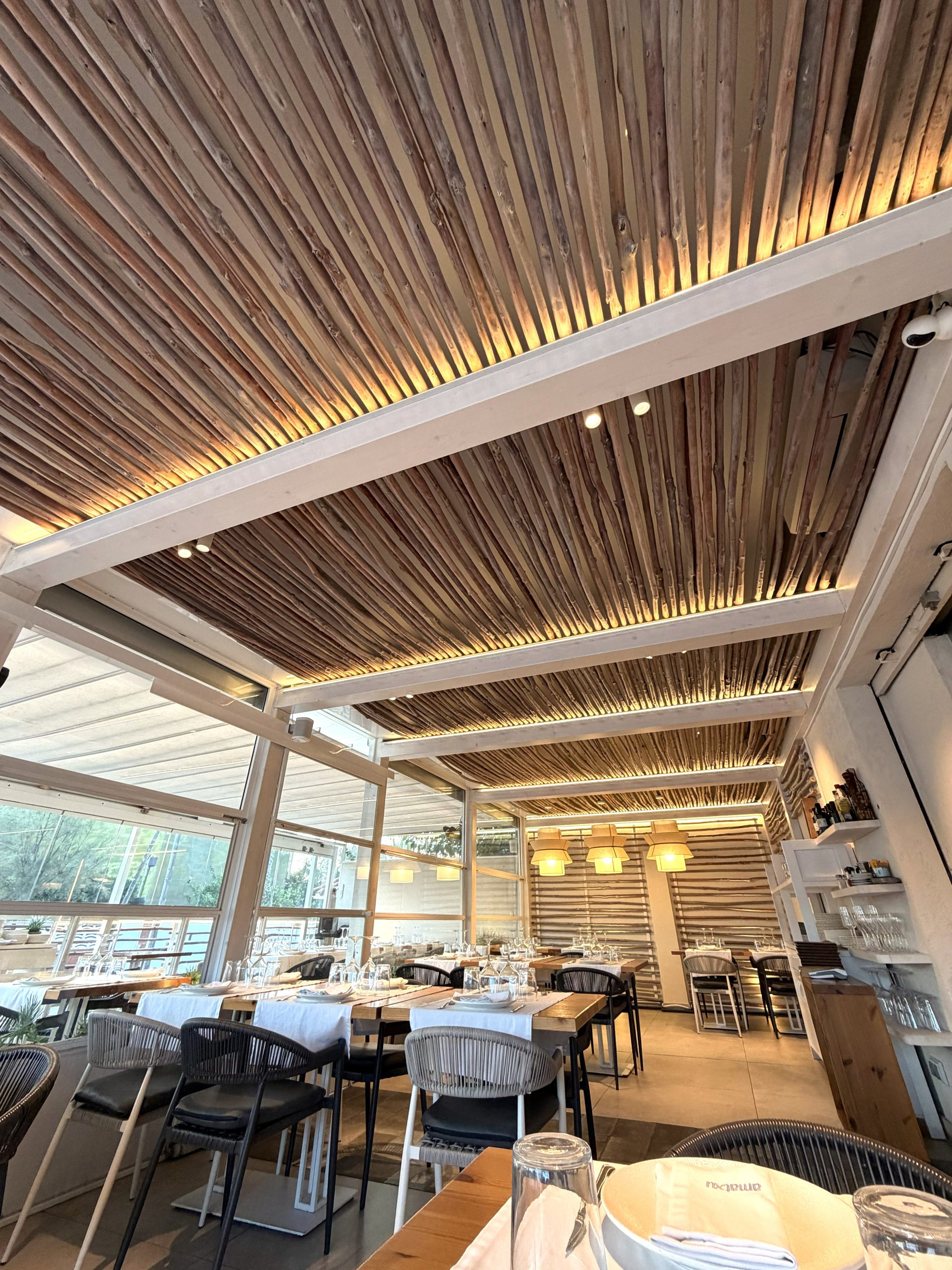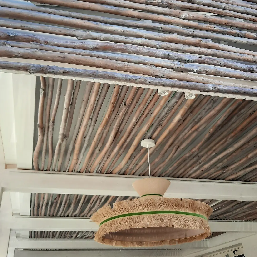 ♦ Realización e instalación de revestimientos decorativos en techos y fachadas, realizados con ramas de castaño segun proyecto de Geensen Interiorsmo.